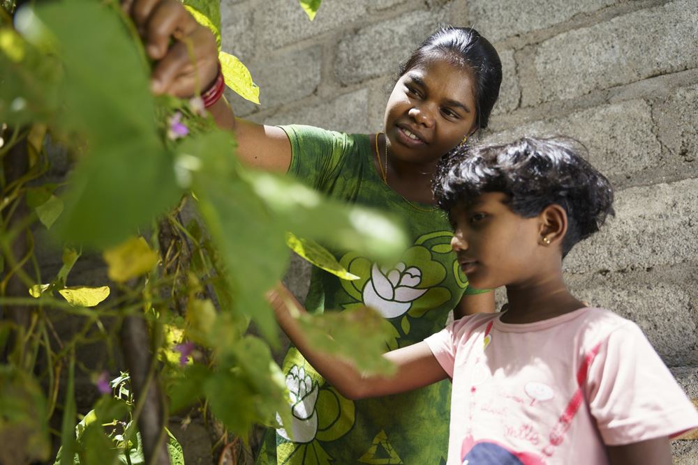 „Das hier ist mein Küchengarten!“ Malar zeigt auf ein Beet in einer Nische der Hauswand und schickt ihre siebenjährige Tochter los, um Wasser zum Gießen zu holen. Die Parzelle ist so klein, dass man sie erst gar nicht als solche erkennen kann. „Ich habe zuerst auch gedacht, dass es unmöglich ist, Gemüse selbst zu ziehen, weil ich einfach keinen Platz dafür habe. Aber die Selbsthilfegruppe hat mich motiviert, es trotzdem zu versuchen“, meint die 28-Jährige, als sie den verwunderten Blick bemerkt. „Sie hatte recht! Immerhin drei Bohnenranken kann ich darin pflanzen. Sie bescheren uns einmal pro Woche eine zusätzliche Mahlzeit. Das ist eine große Hilfe! Denn seit Corona reicht das Geld nur noch für zwei Mahlzeiten am Tag.“ Malar streicht über ihren Bauch. In zwei Monaten kommt ihr zweites Kind. Sich ausgewogen zu ernähren, ist jetzt wichtiger denn je.