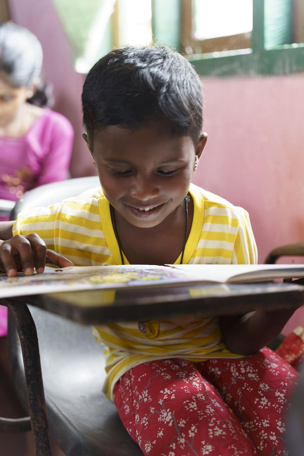 „Die Bibliothek ist mein Lieblingsort. Ich komme jeden Tag hierher. Hier kann ich meine Freundinnen und Freunde treffen, lesen und die Lehrerin fragen, wenn ich etwas in der Schule nicht so richtig verstanden habe“, meint Latha und blättert in ihrem Lieblingsbuch „Unity is strength“. Eine Fabel, in dem es darum geht, was man alles erreichen kann, wenn man zusammenhält. Für Außenstehende mag das Lesezentrum nur ein kahler, etwas feucht riechender Raum mit einer Kreidetafel, 20 Büchern und ebenso vielen harten Holzstühlen sein. Doch für die Kinder der Siedlung, die oft mit bis zu zehn Familienmitgliedern sehr beengt wohnen, ist es ein wichtiger Zufluchtsort.