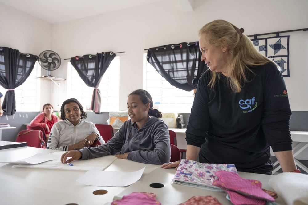 In der Textilwerkstatt sitzen vier junge Mädchen und nähen waschbare Damenbinden. Die können sie nicht nur für sich selbst gut brauchen, sondern sie lernen gleichzeitig etwas, womit sich ein kleines Einkommen erzielen lässt. Während sie ihre Stoffe zuschneiden, erzählen sie von ihrem Alltag. „Der Vater meiner Geschwister hat meine Mutter misshandelt. Ich habe dann immer die Kleinen in Sicherheit gebracht, weil sie so große Angst hatten“, erzählt die 15-jährige Lilica. „Dann habe ich meiner Mutter geraten, sich bei CAF Hilfe zu suchen.“ Mit deren Unterstützung gelang es der Mutter, sich aus der gewalttätigen Beziehung zu lösen.