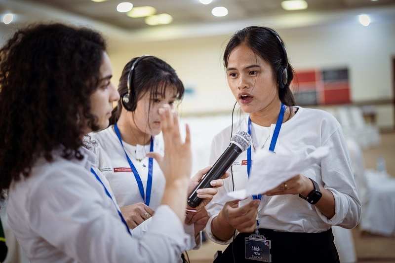 Fünf Tage zuvor, es ist Montagmorgen. Der große Konferenzsaal füllt sich zügig. Die jungen Leute sind aufgedreht. Für viele von ihnen ist es das erste Mal, dass sie von zu Hause weg sind, das erste Mal in einem anderen Land. Das Global Gathering ist für sie alle der Höhepunkt der bisherigen Dialogue Works Kampagne von der Kindernothilfe und terre des hommes. In einer Ecke des Raums spielt eine bunt zusammengewürfelte Truppe Fußball, in der anderen tanzen Mädchen und Buben zu fernöstlichen Klängen, und vorne an der Bühne gibt es enttäuschte Gesichter – die Koffer einiger Kinder sind auf dem Flug verschollen und noch nicht wieder aufgetaucht. Ein Techniker legt noch Kabel zu den sechs Dolmetscherkabinen.