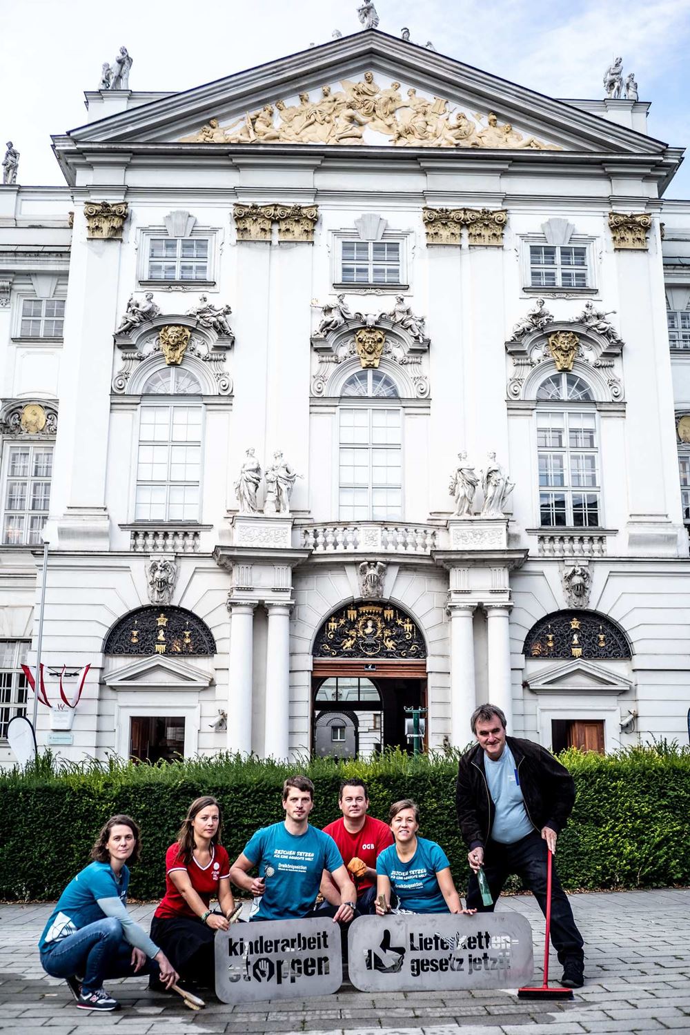 Gemeinsam mit anderen Aktivist*innen und Vertreter*innen namhafter Organisationen sorgt die Kindernothilfe Österreich für einen „Reminder” der besonderen Art: Im Vorfeld des Welttags des Kindes am 20.9. schrubbten sie die Schriftzüge „Kinderarbeit stoppen” und „Lieferkettengesetz jetzt!” vor die Türen des Justiz- und des Wirtschaftsministeriums. „Damit wollen wir die verantwortlichen Stellen in den nächsten Tagen und Wochen auf dem Weg in ihre Büros daran erinnern, dass ihnen als koordinierende Minister*innen eine wichtige Rolle in den Verhandlungen um ein starkes europäisches Lieferkettengesetz, das wirksam gegen Kinderarbeit vorgeht, zukommt”, so Sigrid Kickingereder für das Bündnis „Kinderarbeit stoppen”.